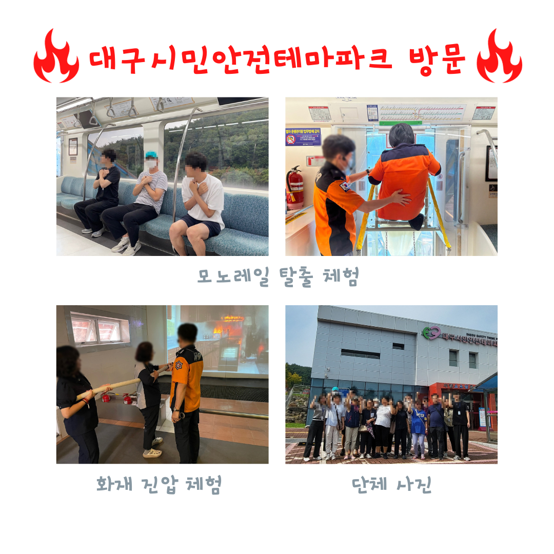 [수성베네스트] 대구 시민안전테마파크에 다녀왔습니다~ 수성베네스트 0 301 2023.10.06 09:55 안녕하세요 수성베네스트입니다~저희 수성베네스트에는 당사자와 함께 '대구 시민안전테마파크'에 방문하여 소방교육을 받았습니다~위기 상황에서 화재를 진압하고 탈출할 수 있는 화재진압체험과 완강기의 설치 방법을 학습하고 직접 하강해 보는 체험을 하였습니다.소방교육을 통해서 재난 상황에서 신속하고 능동적으로 대처할 수 있는 대응능력을 향상시킬 수 있었던 시간이었습니다!앞으로도 수성베네스트는 당사자분들의 안전과 위기 대응능력 향상을 위해 안전교육을 실시할 예정이니 많은 관심과 응원 부탁드립니다!
