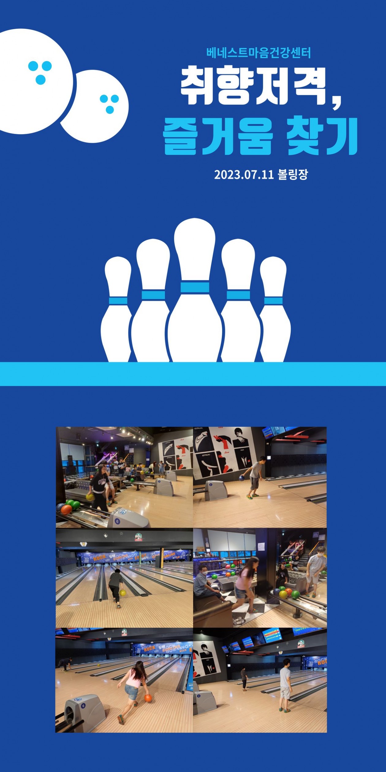 [베네스트마음건강센터] 7월의 취미여가활동, 볼링 베네스트마음건강센터 0 409 2023.08.02 16:05 안녕하세요. 베네스트마음건강센터입니다~!7월 11일. 취미여가활동으로 볼링을 하기 위해 볼링장에 다녀왔습니다.회원분들은 볼링을 치면서 적절한 여가활용 방법을 익히고 스트레스를 해소할 수 있었습니다. :)8월의 활동 소식도 많은 관심 부탁드립니다.