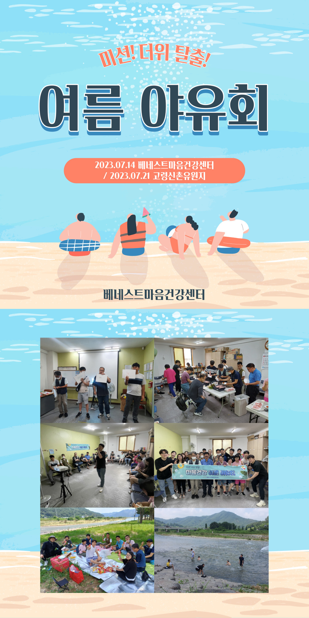[베네스트마음건강센터] 미션! 더위탈출! 마음건강 여름 야유회 베네스트마음건강센터 0 390 2023.08.02 16:12 안녕하세요. 베네스트마음건강센터입니다~!여름을 맞이하여 7월 14일 여름 야유회가 예정되어있었으나, 우천으로 인해 센터 내에서 레크레이션과 노래자랑을 하며 재미있는 시간을 보냈습니다.아쉬운 마음을 달래기 위해 7월 21일 고령 신촌유원지에 가서 물놀이를 하고 수박과 간식을 먹으며 즐거운 시간을 보냈습니다.여름 야유회를 통해 더위와 스트레스를 날려버릴 수 있었습니다. :)8월의 활동 소식도 많은 관심 부탁드립니다.