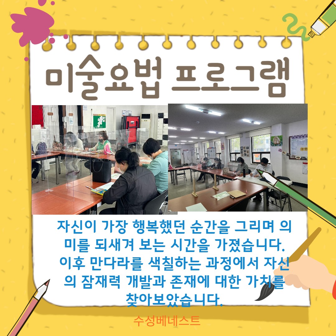 [수성베네스트] 2023년 수성베네스트 미술요법프로그램 '내 마음에 노크'를 소개합니다! 수성베네스트 0 466 2023.05.03 19:07 안녕하세요 수성베네스트 입니다 :)수성베네스트에서는 이번에 미술요법 프로그램 1회기 진행하였습니다.자신이 가장 행복했던 순간을 그림으로 표현해 보고, 다른 회원들과 그림에 대해 이야기를 나누며 추억을 회상해 보고 공유해 보는 시간을 가졌습니다.당사자의 소감으로는 "행복했던 기억을 그림으로 표현하여 이야기 나눠보니 좋았다. "라는 이야기를 나눴습니다~수성베네스트에서는 앞으로도 다양한 미술 재료를 활용하여 즐거운 활동이 진행될 예정이니 많은 응원과 관심 부탁드립니다 ~
