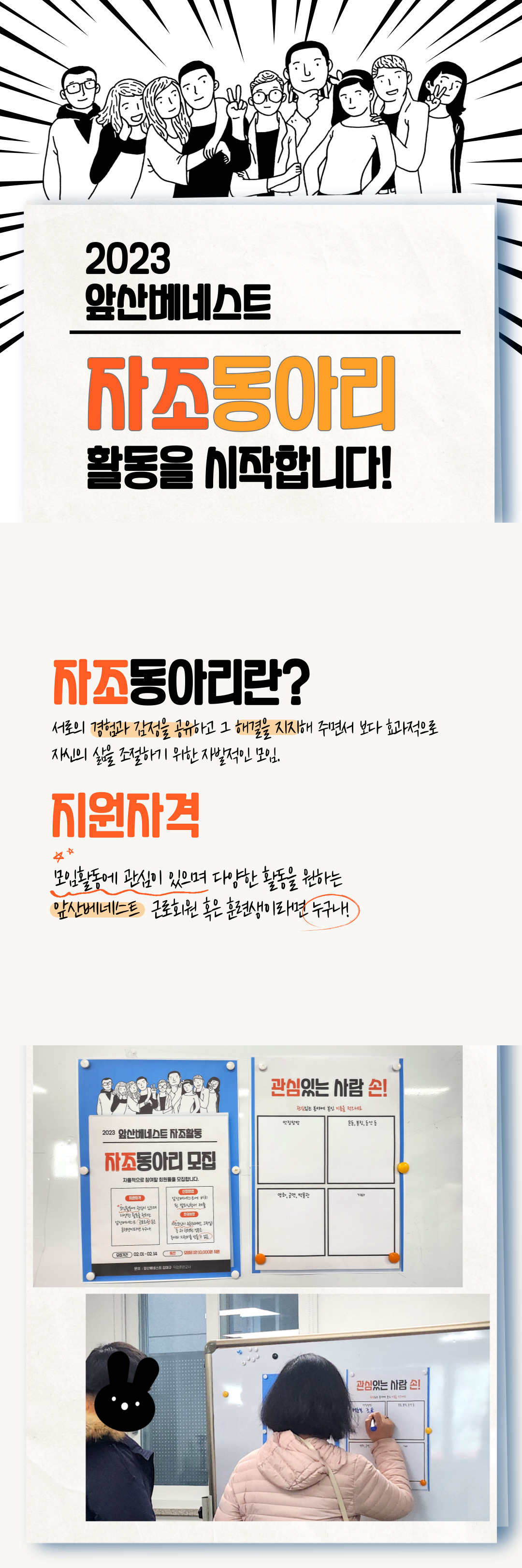[앞산베네스트] 자조동아리를 시작합니다! 앞산베네스트 0 471 2023.02.07 16:00 안녕하십니까 앞산베네스트입니다.앞산베네스트는 23년을 맞이하여 자조동아리를 시작하고자 합니다.회원들이 스트레스 해소와 정서적 지지를 얻고일상의 활력이 불어넣어지길 기대하며 2월에 모집 마감을 하고분기별로 자조동아리 활동하기로 계획하였습니다.앞으로 회원들이 만들어가는 자조동아리에 대해많은 응원과 관심 부탁드립니다!감사합니다.