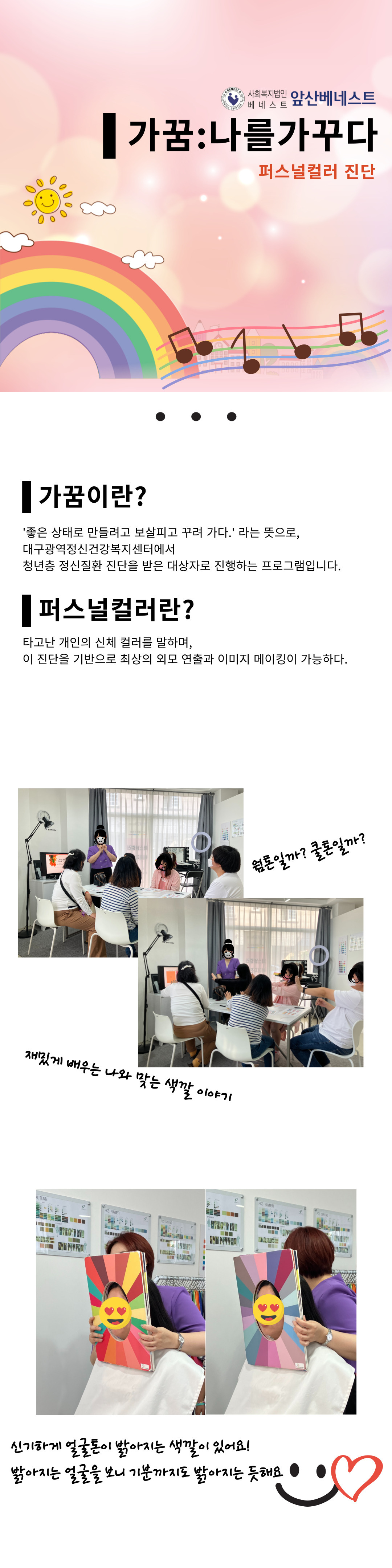[앞산베네스트] 가꿈:나를가꾸다. 퍼스널컬러 알아보기 앞산베네스트 0 542 2022.11.03 14:51 안녕하십니까 앞산베네스트입니다.대구광역정신건강복지센터와 함께 청년층 대상으로'가꿈:나를가꾸다.'라는 프로그램을 4회 실시하였습니다.나에게 맞는 색깔과 외모를 가꾸는 방법을 알고 배워가는 것이흥미롭고 유익한 프로그램이었습니다.앞으로도 앞산베네스트에 많은 관심과 응원부탁드립니다.감사합니다!