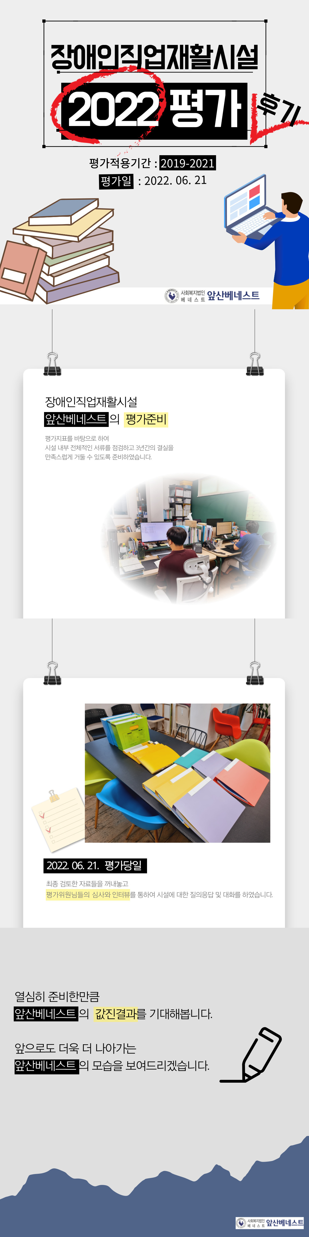 [앞산베네스트] 장애인직업재활시설 2022 평가 후기 앞산베네스트 0 516 2022.07.04 17:58 안녕하십니까, 앞산베네스트입니다.장애인직업재활시설 평가가 지난 6월 21일에 진행되었습니다.평가 당일이 되기 전까지 그간의 자료를 총 점검하고 준비하면서지난 3년 간의 결실을 얻을 수 있도록 노력하였습니다.아직 결과는 나오지 않았지만 준비한 만큼 값진 결과를 기대해 봅니다.앞산베네스트는 앞으로도 더욱 더 나아가고장애인직업재활을 위해 최선을 다하는 모습 보여드리겠습니다.많은 성원과 격려 부탁드립니다.