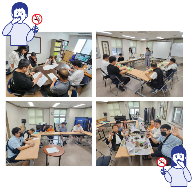 비콘에서는 대구금연지원센터와 연계하여 7월 한달(4회기) 동안 매주 목요일에 찾아가는 금연지원 서비스를 지원하였습니다. 금연을 희망하는 회원들을 모집하여 금연의 필요성과 위험성에 대해 교육하고 일산화탄소 검사를 통해 내 폐의 건강도 체크해보는 시간을 가졌습니다. 회원들의 금연을 돕기 위해 매회 금연 상담과 함께 보조제를 지급하여 금연 성공률을 높일 수 있도록 노력했습니다. 이 외에도 클레이 만들기 및 다육이 만들기를 통해 금연 의지를 다짐했습니다. 모두 금연 화이팅!