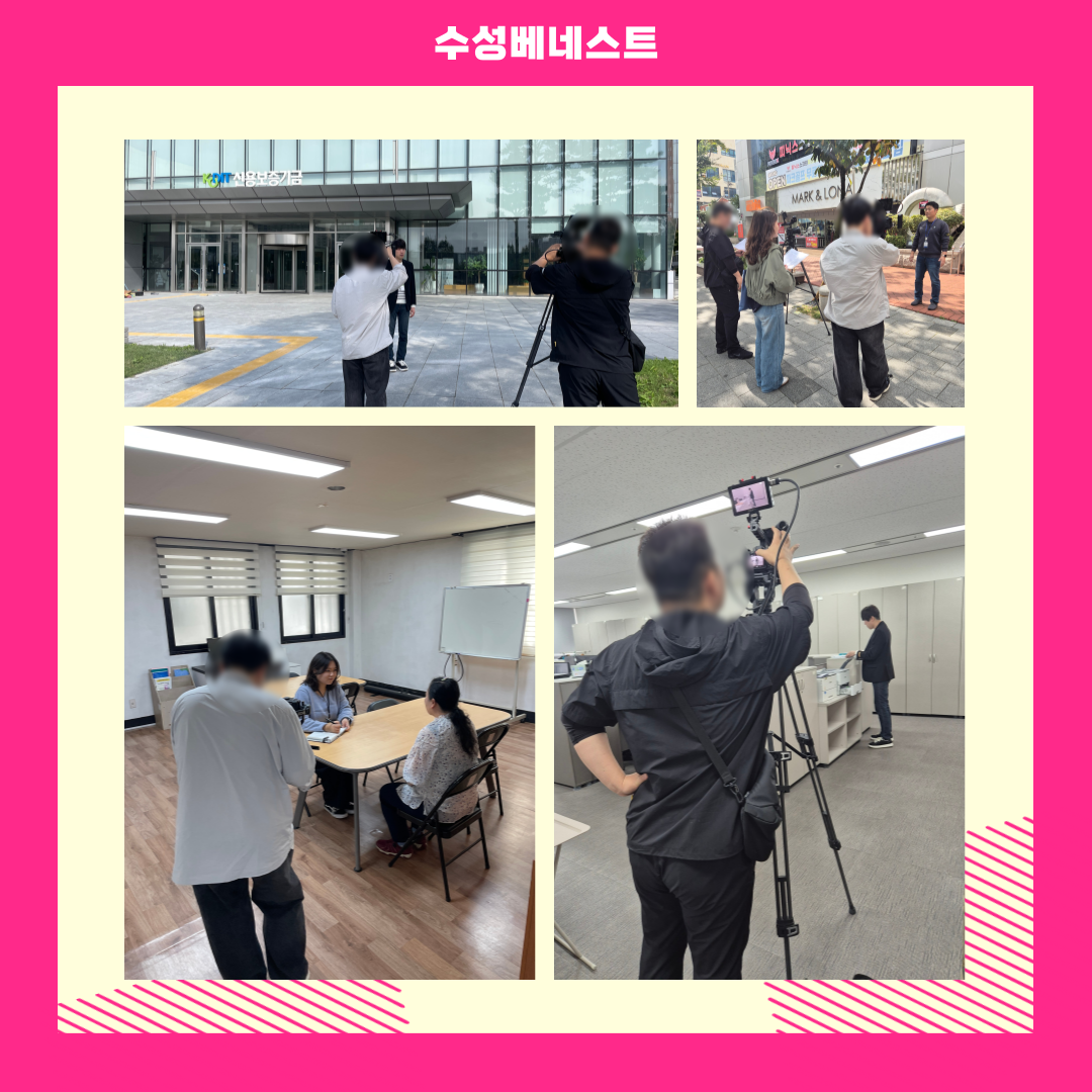 촬영 과정에서는 취업자 회원들의 인터뷰를 비롯해 시설 내부 면담 장면, 프로그램 진행 모습 등 수성베네스트의 일상과 활동을 생생하게 담았습니다.