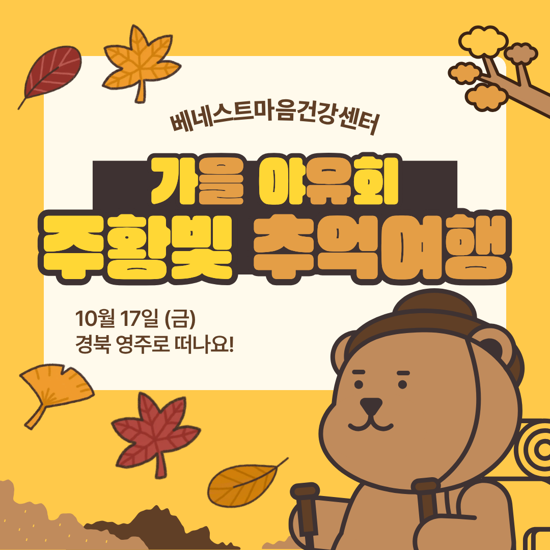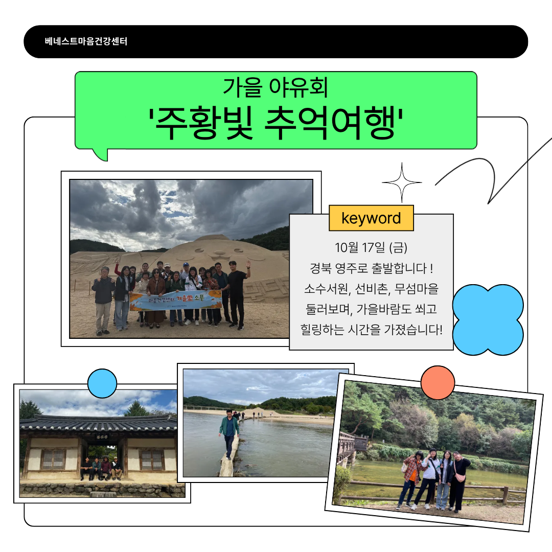 [베네스트마음건강센터] 2025년 가을야유회 '주황빛 추억여행' 다녀오다! 베네스트 0 59 11.03 11:53 안녕하세요! 베네스트마음건강센터입니다!이번 10월 17일, 베네스트마음건강센터 회원분들과 함께 가을야유회에 다녀왔습니다!영주 소수서원, 선비촌, 무섬마을 등 가을의 정취를 느끼며, 스트레스를 훨훨 날리는 시간이 되었습니다.
