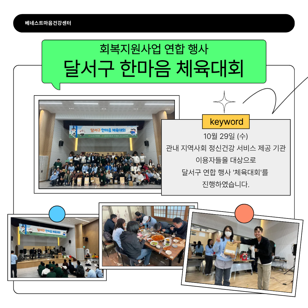 [베네스트마음건강센터] 회복지원사업 연합행사 '달서구 한마음 체육대회'로 함께 하다! 베네스트 0 62 11.03 11:56 안녕하세요. 베네스트마음건강센터입니다.10월 29일, 달서구 내 3개의 기관이 함께 연합하여 '달서구 한마음 체육대회'를 개최하였습니다.(달서구 정신건강복지센터, 대구재활센터, 베네스트마음건강센터)그동안의 스트레스를 잊어버리고, 함께 춤도 추고, 맛있는 음식도 먹으며기관이 연합되고 서로 알아가는 소중한 시간이 되었습니다.매년 행사를 개최할 예정이니 많은 관심 부탁드리겠습니다!