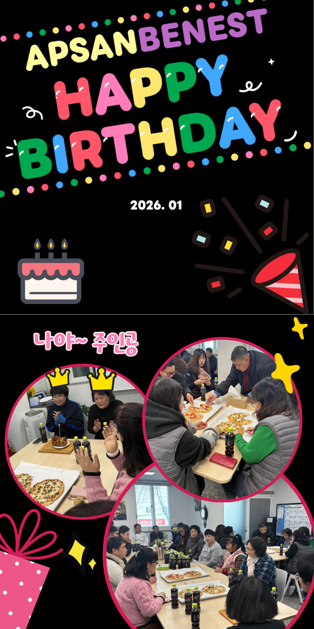 [앞산베네스트]생일파티 베네스트 0 50 02.05 11:16 안녕하십니까, 앞산베네스트입니다.앞산베네스트에서는 2026년의 첫 달을 맞이하여, 1월 생일을 맞은 회원분들을 위한 작은 생일파티를 진행하였습니다.회원들의 웃음 속에서 서로에게 전해지는 따뜻한 마음을 느낄 수 있었고, 새해의 시작을 더욱 기분 좋게 열 수 있었습니다.앞으로도 앞산베네스트는 회원 한 분 한분의 소중한 순간을 함께하며, 행복이 머무는 공간이 되기 위해 노력하겠습니다.다시 한 번 1월의 주인공들께 진심으로 축하의 마음을 전합니다.
