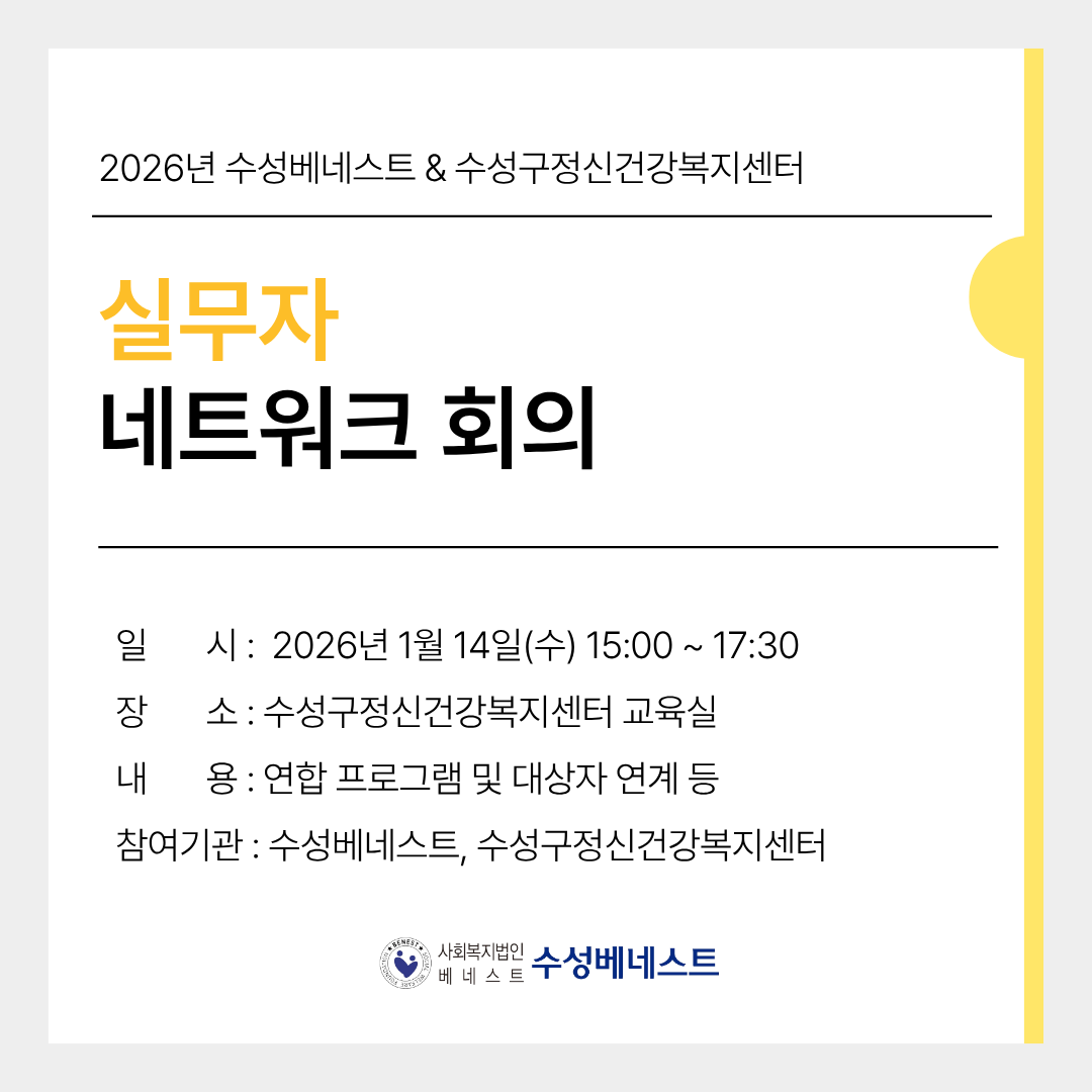 [수성베네스트] 2026년 수성베네스트 & 수성구정신건강복지센터 실무자 네트워크 회의 베네스트 0 49 02.05 12:07 안녕하세요, 수성베네스트 입니다.2026년을 맞이하여 수성구정신건강복지센터와 함께 실무자 네트워크 회의를 진행하였습니다.지역사회 정신건강과 대상자의 회복을 중심으로연합 프로그램 운영 및 회원 연계 방향을 공유하였으며, 이를 바탕으로 기관 간 협력 체계를 강화하였습니다.앞으로도 정기적인 실무자 네트워크 회의를 통해 연합 프로그램을 지속적으로 운영하고,회원 연계를 강화해 나갈 수 있도록 노력하겠습니다.감사합니다.