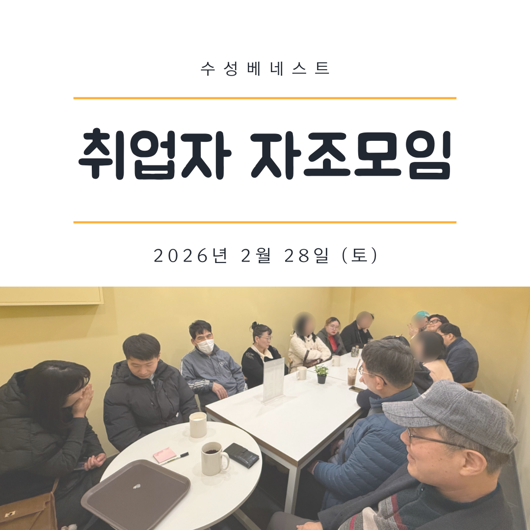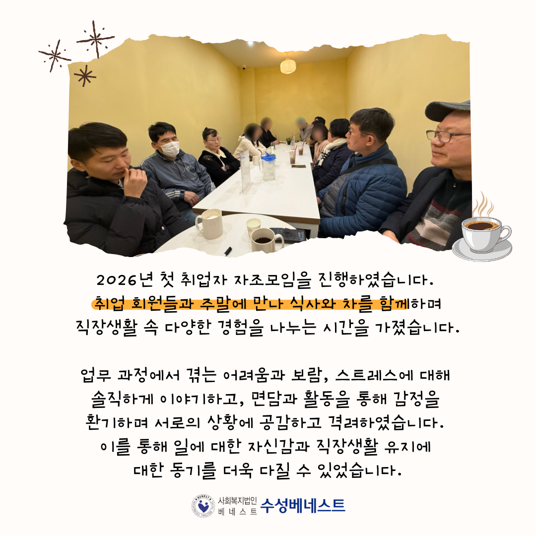 [수성베네스트] 취업 이후, 그리고 그 다음 이야기 베네스트 0 2 3시간전 안녕하세요 수성베네스트입니다.2026년 첫 취업자 자조모임을 진행하였습니다.취업 회원들과 주말에 만나 식사와 차를 함께 하며 직장생활 속 다양한 경험을 나누는 시간을 가졌습니다.업무 과정에서 겪는 어려움과 보람, 스트레스에 대해 솔직하게 이야기하고, 면담과 활동을 통해 감정을 환기하며 서로의 상황에 공감하고 격려하였습니다.이를 통해 일에 대한 자신감과 직장생활 유지에 대한 동기를 더욱 다질 수 있었습니다.