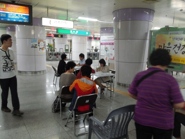 회원들과 함께 서문시장역에서 무료로 치매검사와 심리검사를 해주는 봉사를 하였습니다.
