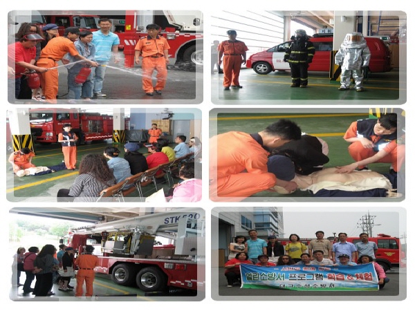 수성 소방서를 방문하여 소화기 사용방법, 응급 시 구조방법, 소방차 및 구급차의 내부 구조, 방염성 피복 등에 대해 알아보고 직접 체험을 해보는 유익한 시간을 가졌습니다.