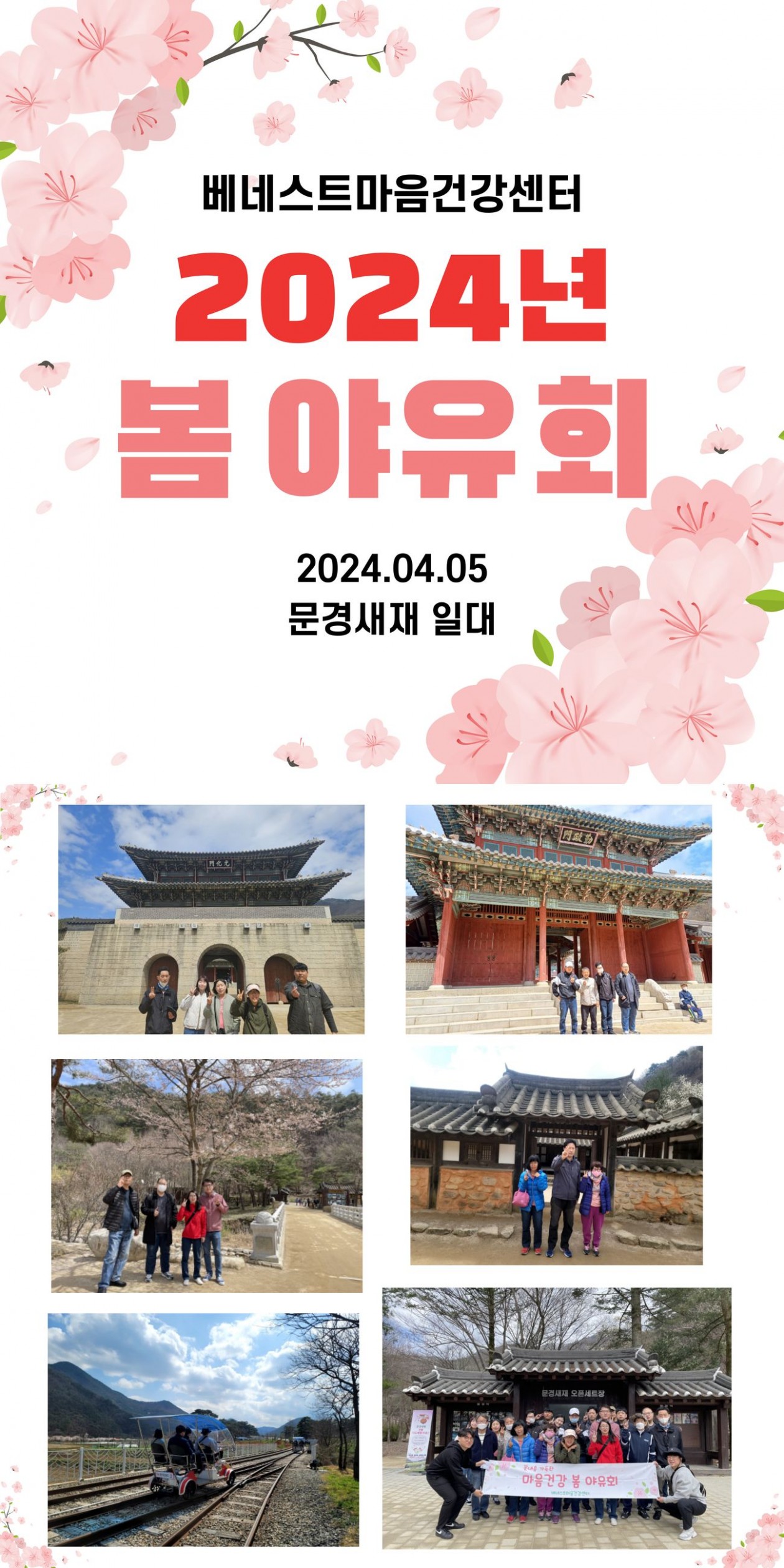[베네스트마음건강센터] '달디단~ 봄바람~' 마음건강 봄 야유회 베네스트마음건강센터 0 167 2024.05.02 09:59 안녕하세요~! 베네스트마음건강센터입니다.2024년 4월 5일, 문경 일대로 봄 야유회를 다녀왔습니다.문경새재도립공원을 구경하고 레일바이크를 타며친밀감을 향상하고 즐거운 시간을 보냈습니다.오랜만의 야유회에 기분을 전환하고 스트레스를 해소할 수 있었습니다. :)5월 활동 소식도 많은 관심 부탁드립니다.