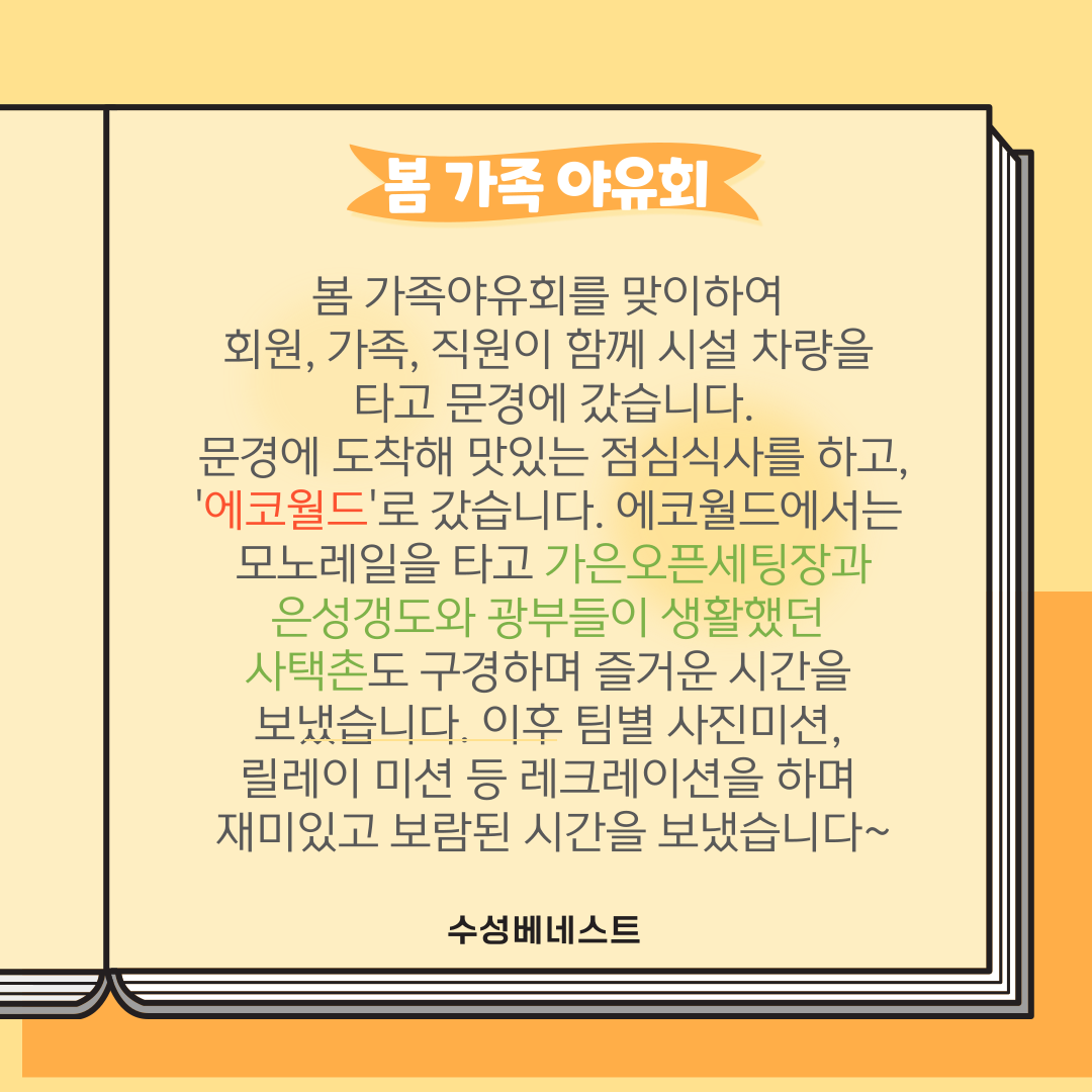 [수성베네스트] 봄 가족야유회를 다녀오다! 수성베네스트 0 165 2024.05.07 08:11 안녕하세요, 수성베네스트에서는 지난 4월 19일(금) 회원, 가족, 직원이 함께 '문경 에코월드'로 봄 가족 야유회를 다녀왔습니다.따뜻한 날씨와 봄 내음을 맡으며 지친 일상을 환기할 수 있었고'영화 세트장, 탄광사택촌, 은성갱도' 등 다양한 볼거리 구경과 회원분들이 직접 기획한 레크레이션을 하며 즐거운 추억을 쌓는 시간이 되었습니다.앞으로도 수성베네스트에 많은 관심과 응원 부탁드립니다!