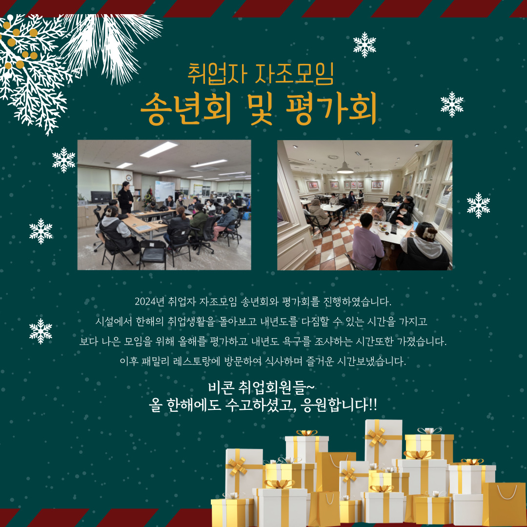 [비콘] 취업자 자조모임 2024년 송년회 및 평가회 비콘 0 171 01.03 18:05 2024년 취업자 자조모임 송년회와 평가회를 진행했습니다.시설에서 한해의 취업생활을 돌아보고 내년도를 다짐할 수 있는 시간을 가지고보다 나은 모임을 위해 올해를 평가하고 내년도 욕구를 조사하는 시간 또한 가졌습니다.이후 패밀리 레스토랑에 방문하여 식사하며 즐거운 시간을 보냈습니다.